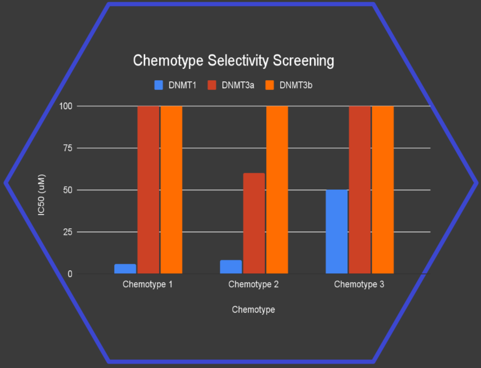 We made and tested just 40 compounds, yet found 3 novel chemotypes* active against DNMT1 with strong selectivity over DNMT3a and DNMT3b.